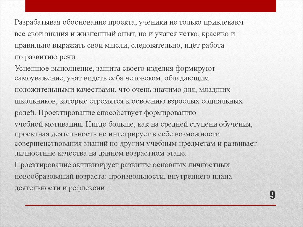 Разрабатывая обоснование проекта, ученики не только привлекаютвсе свои знания и жизненный опыт, но и учатся четко, красиво и
