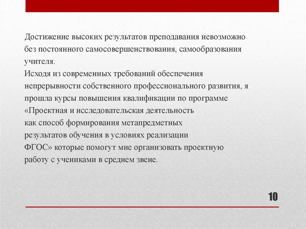 Достижение высоких результатов преподавания невозможнобез постоянного самосовершенствования, самообразования
