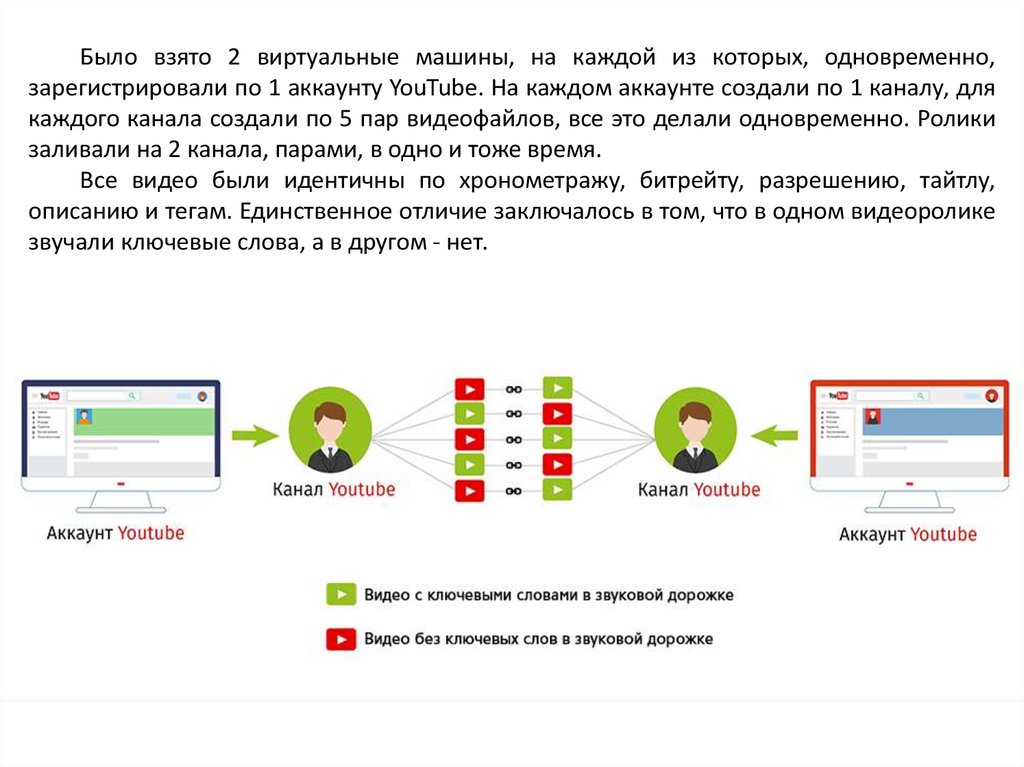 Было взято 2 виртуальные машины, на каждой из которых, одновременно,зарегистрировали по 1 аккаунту YouTube. На каждом аккаунте создали по 1 каналу, для