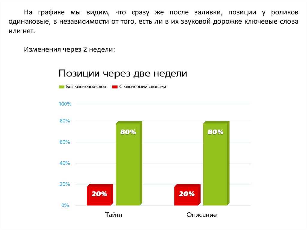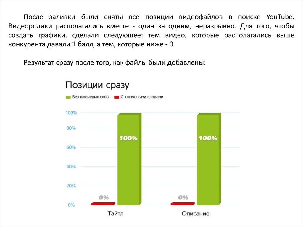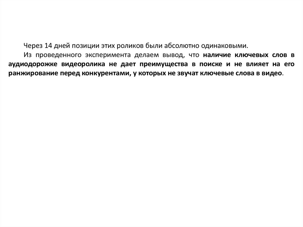 Через 14 дней позиции этих роликов были абсолютно одинаковыми.Из проведенного эксперимента делаем вывод, что наличие ключевых слов в