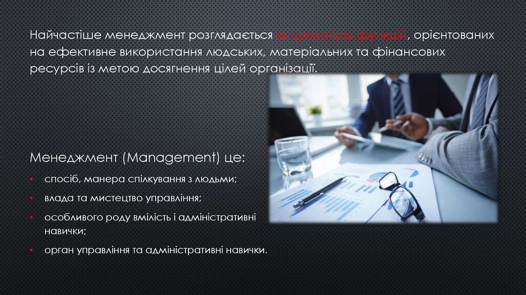 Найчастіше менеджмент розглядається як сукупність функцій, орієнтованихна ефективне використання людських, матеріальних та фінансових