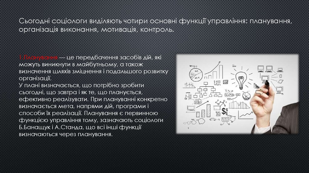 Сьогодні соціологи виділяють чотири основні функції управління: планування,організація виконання, мотивація, контроль.