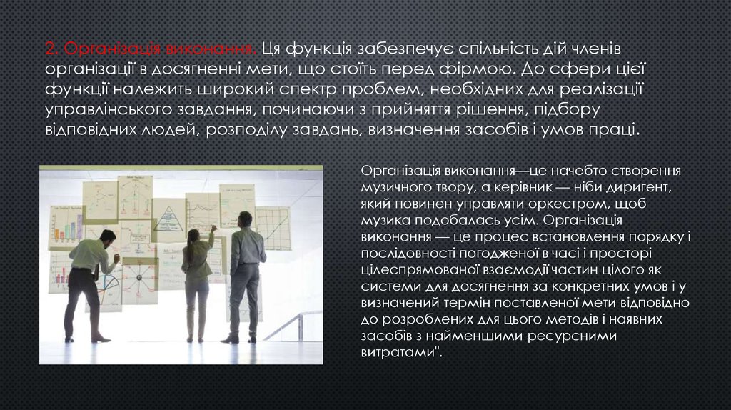 2. Організація виконання. Ця функція забезпечує спільність дій членіворганізації в досягненні мети, що стоїть перед фірмою. До сфери цієї