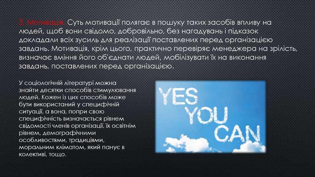 3. Мотивація. Суть мотивації полягає в пошуку таких засобів впливу налюдей, щоб вони свідомо, добровільно, без нагадувань і підказок