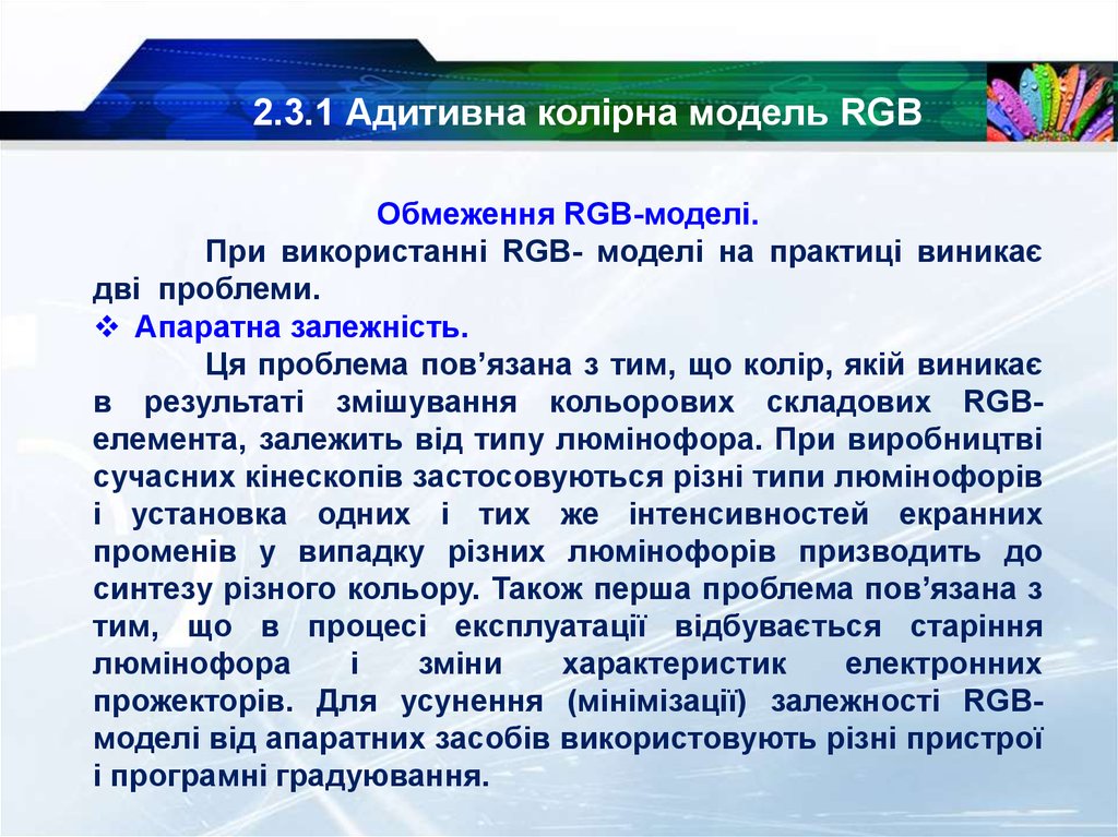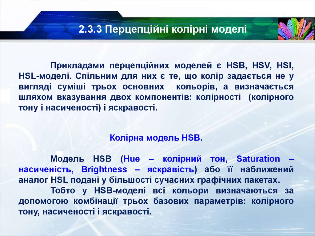 2.3.3 Перцепційні колірні моделіПереваги і обмеження HSB-моделі.