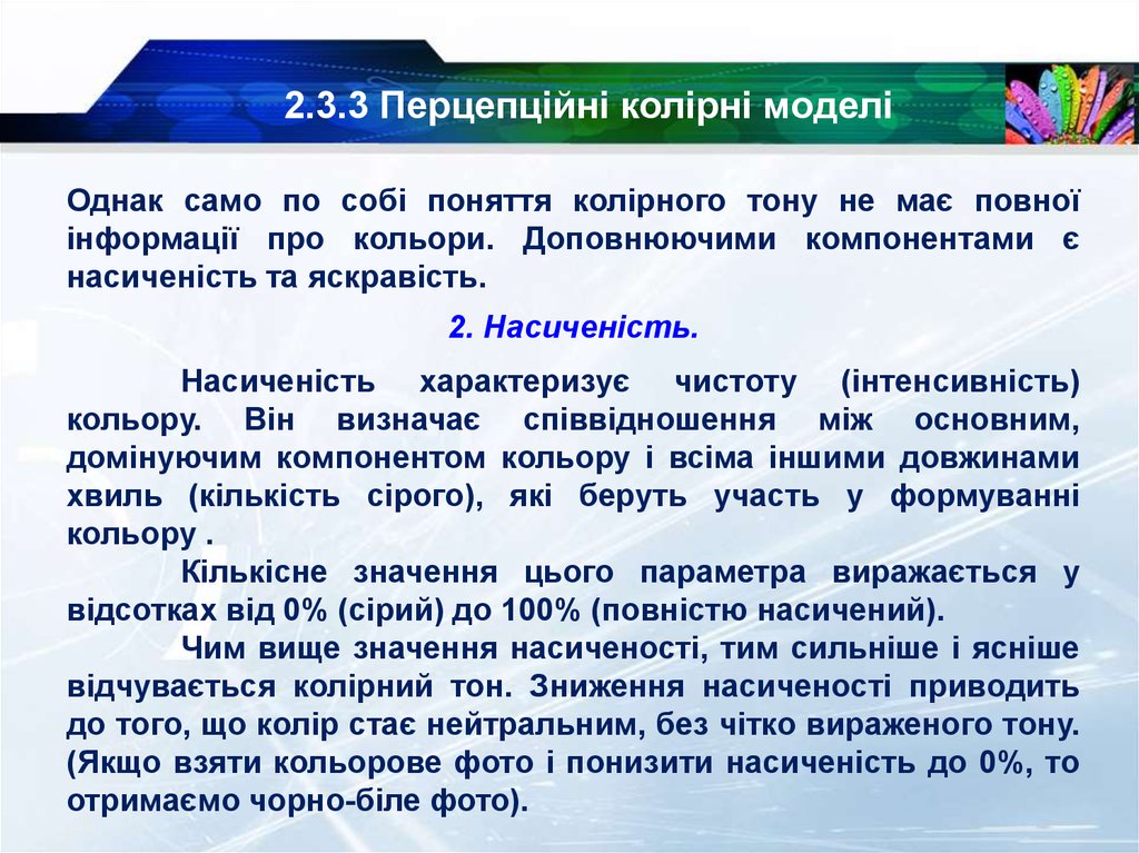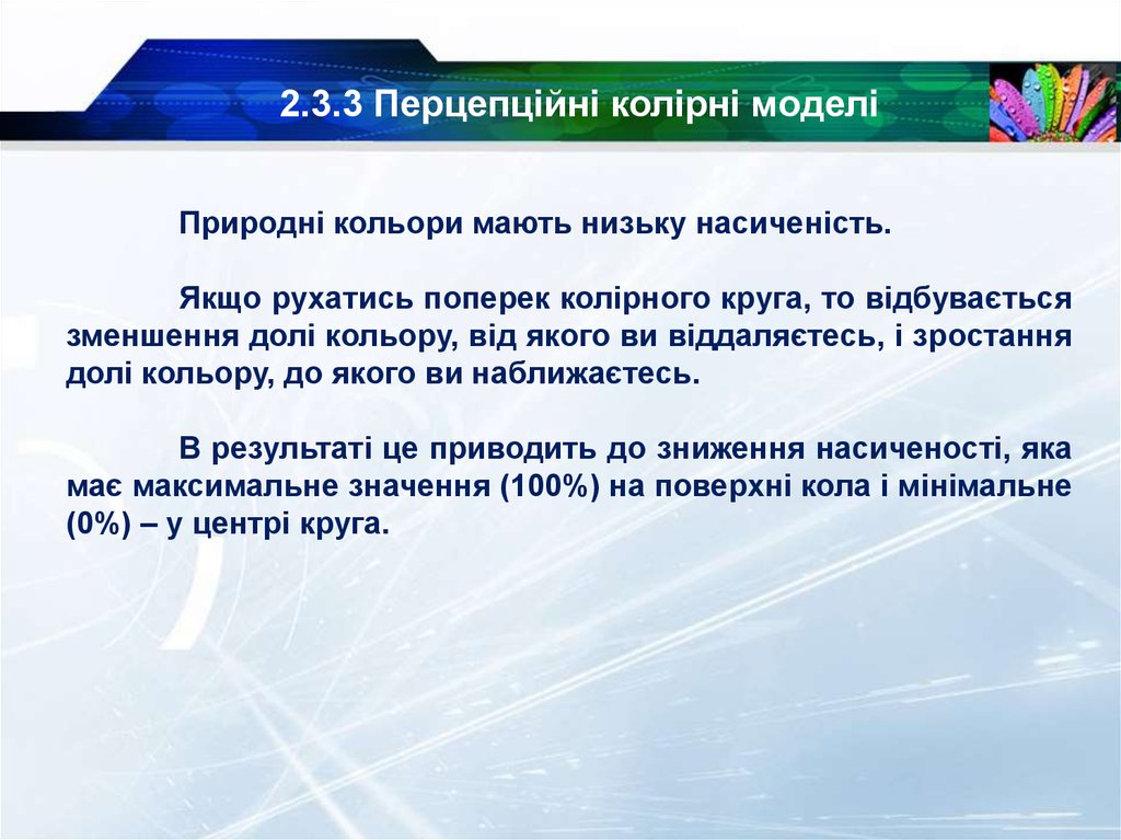 2.3.3 Перцепційні колірні моделіПриродні кольори мають низьку насиченість.