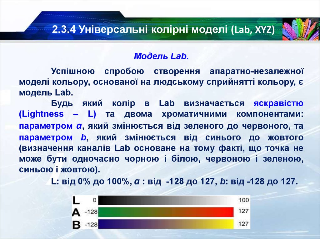 2.3.4 Універсальні колірні моделі (Lab, XYZ)Модель Lab.