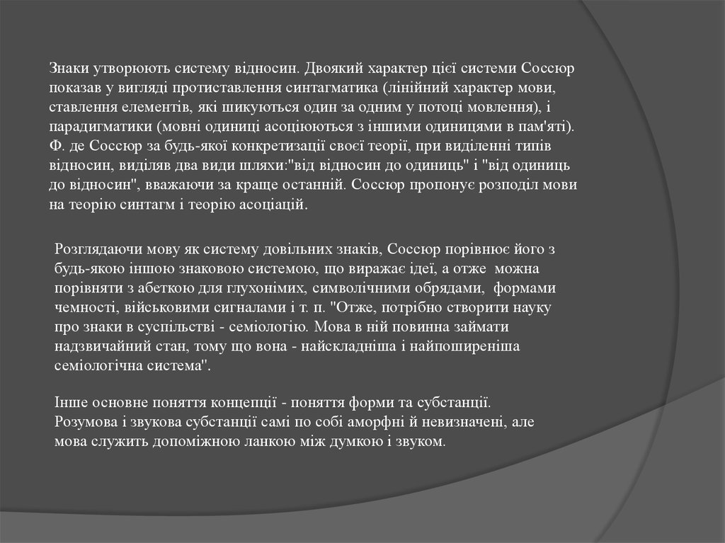 Соссюр всіляко підкреслював системний характер мови іобгрунтував його знакову природу. На його думку, мовні