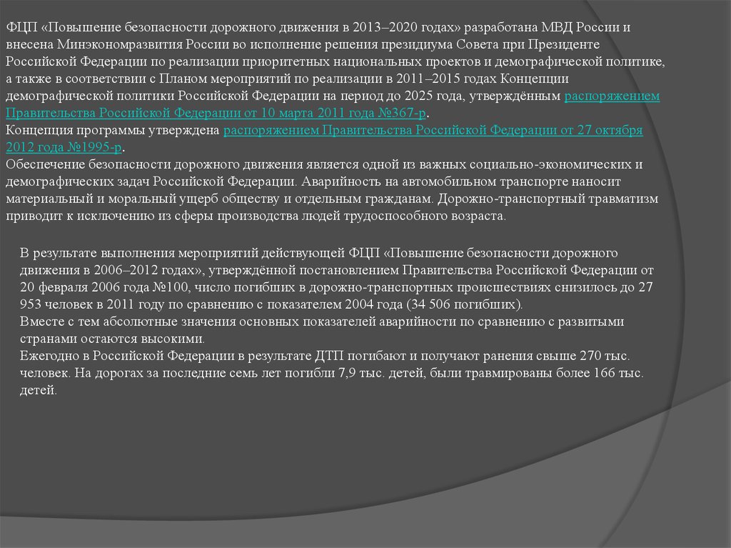 ФЦП «Повышение безопасности дорожного движения в 2013–2020 годах» разработана МВД России ивнесена Минэкономразвития России во исполнение решения президиума Совета при Президенте