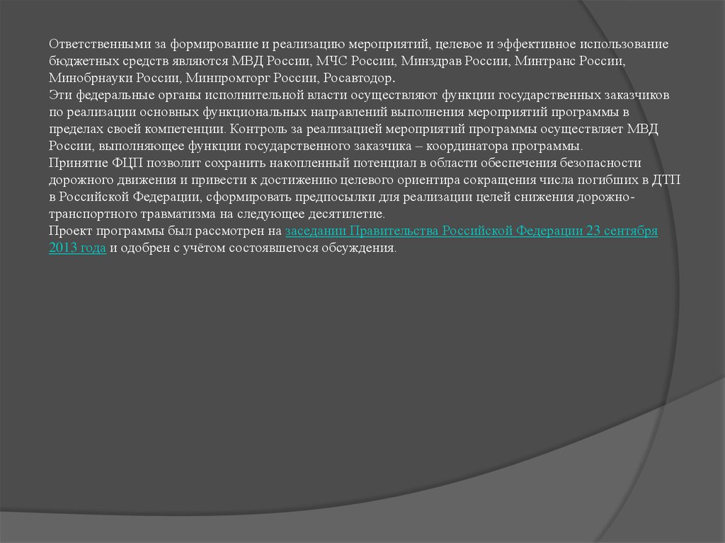 Ответственными за формирование и реализацию мероприятий, целевое и эффективное использованиебюджетных средств являются МВД России, МЧС России, Минздрав России, Минтранс России,