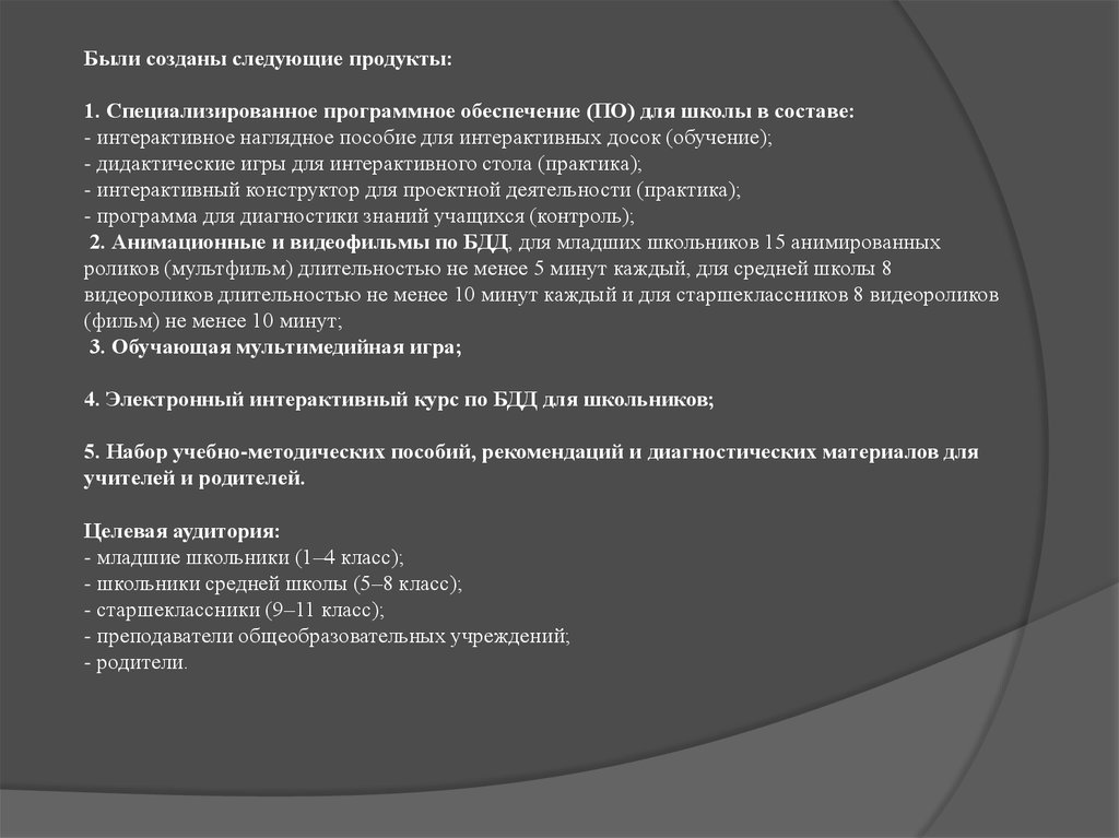 Были созданы следующие продукты:1. Специализированное программное обеспечение (ПО) для школы в составе: