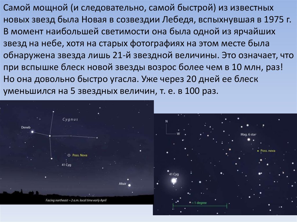 Самой мощной (и следовательно, самой быстрой) из известныхновых звезд была Новая в созвездии Лебедя, вспыхнувшая в 1975 г.