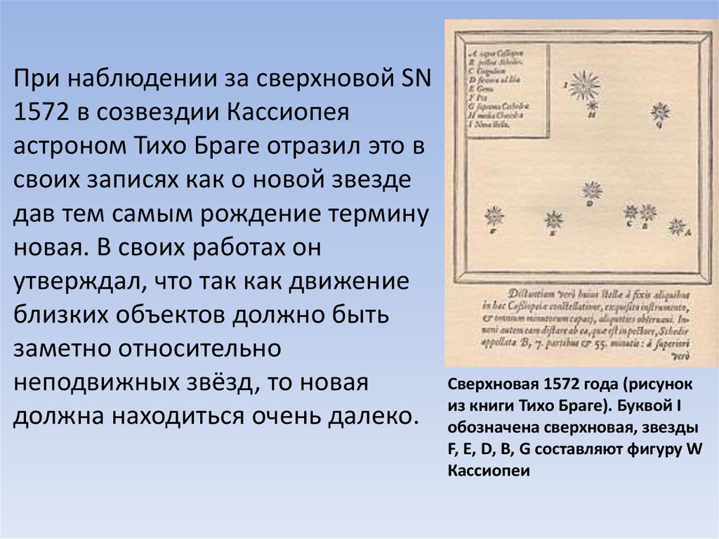 11 ноября 1572 года Тихо Браге, возвращаясь домой из химическойлаборатории, заметил в созвездии Кассиопеи необычайно яркую
