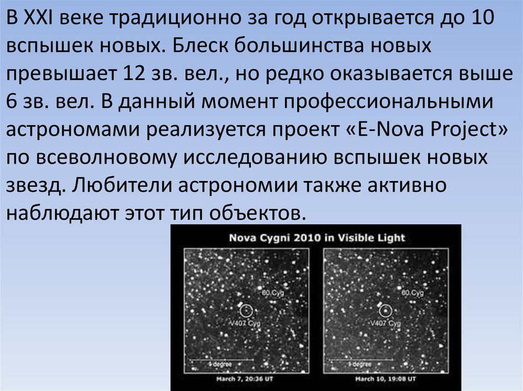 В XXI веке традиционно за год открывается до 10вспышек новых. Блеск большинства новых
