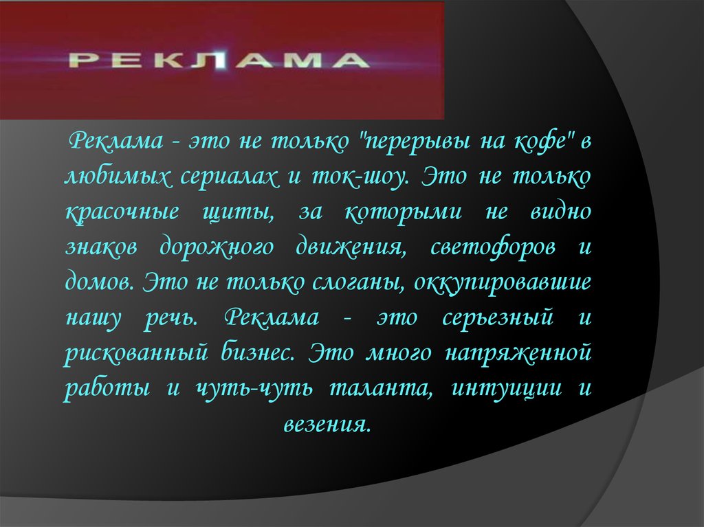 Реклама - это не только "перерывы на кофе" влюбимых сериалах и ток-шоу. Это не только