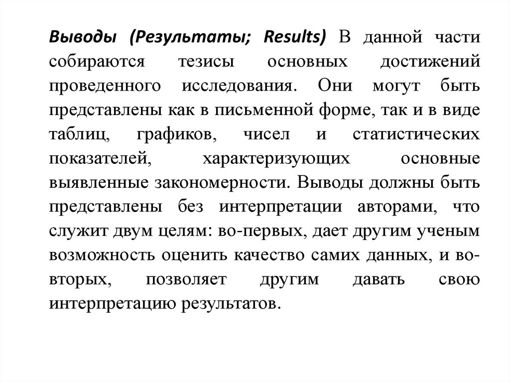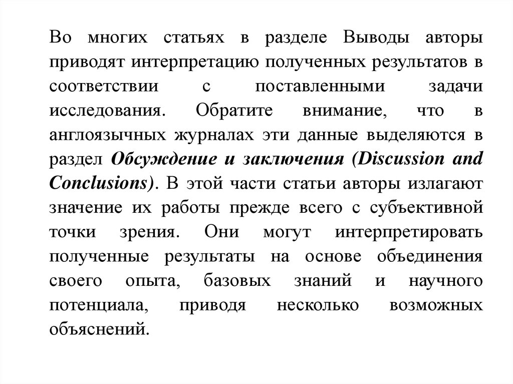 Во многих статьях в разделе Выводы авторыприводят интерпретацию полученных результатов в