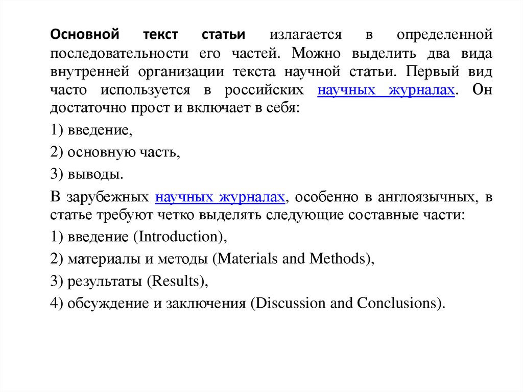 Основной текст статьи излагается в определеннойпоследовательности его частей. Можно выделить два вида