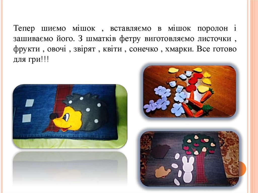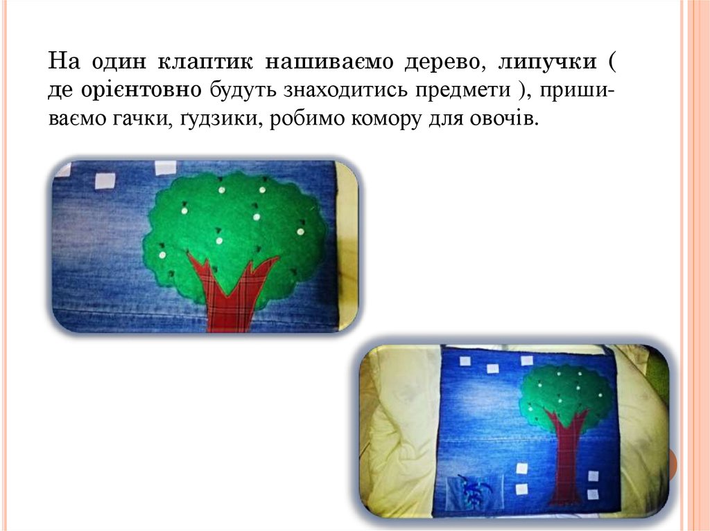 На один клаптик нашиваємо дерево, липучки (де орієнтовно будуть знаходитись предмети ), пришиваємо гачки, ґудзики, робимо комору для овочів.