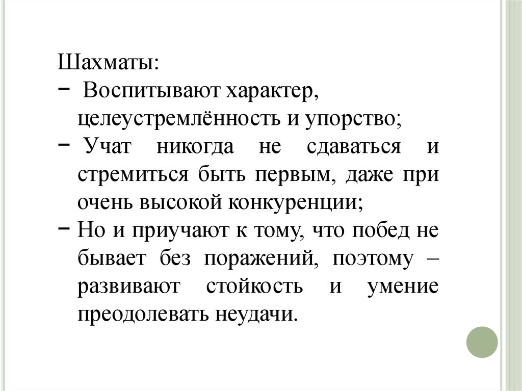 13. Шахматы дают возможность развития интеллекта в игровой форме. Игра развивает мышление, учит обобщать и сравнивать, делать выводы. Обучение