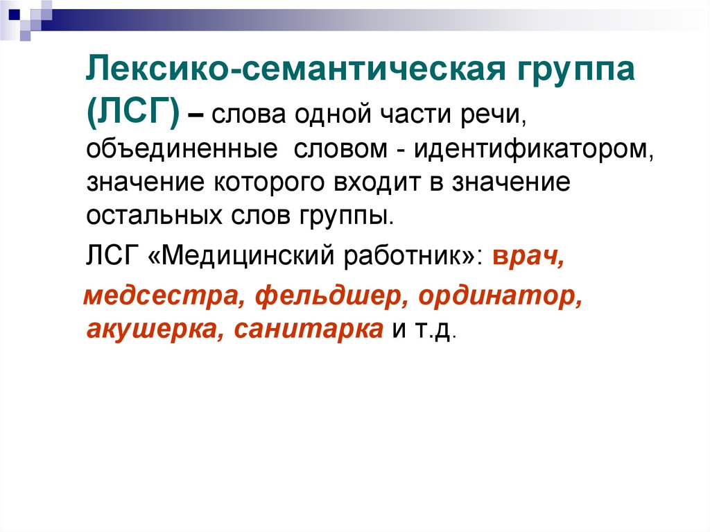 Лексико-семантическая группа(ЛСГ) – слова одной части речи,