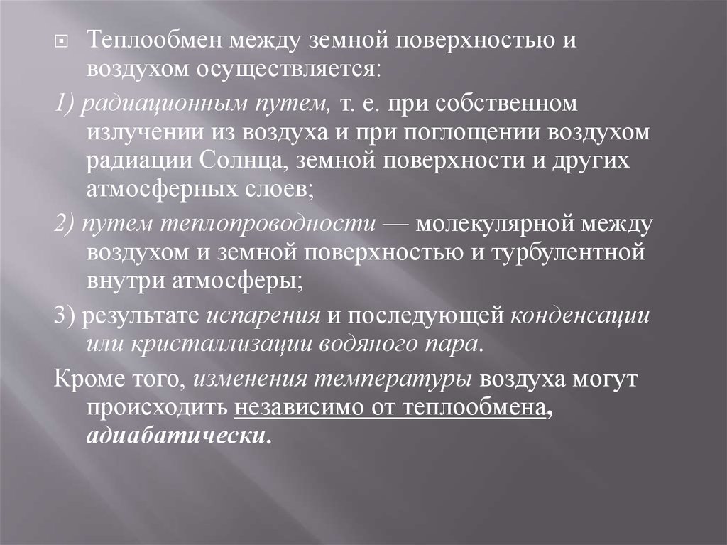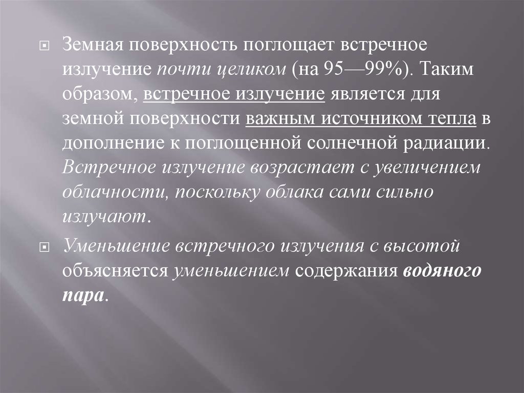Земная поверхность поглощает встречноеизлучение почти целиком (на 95—99%). Таким