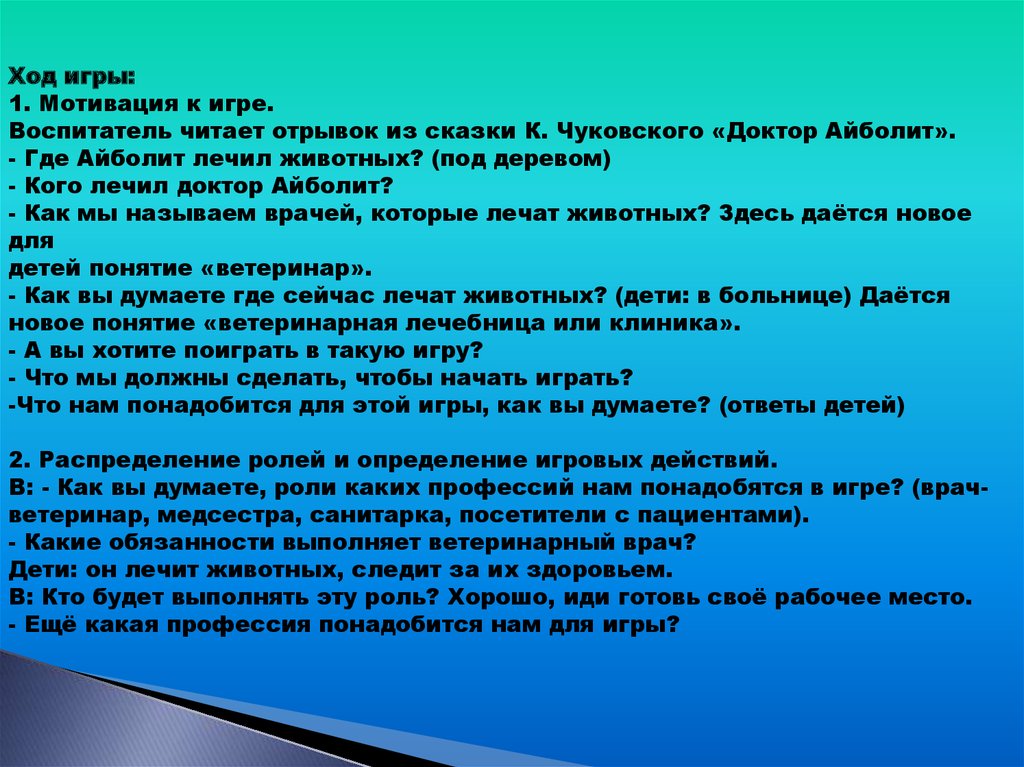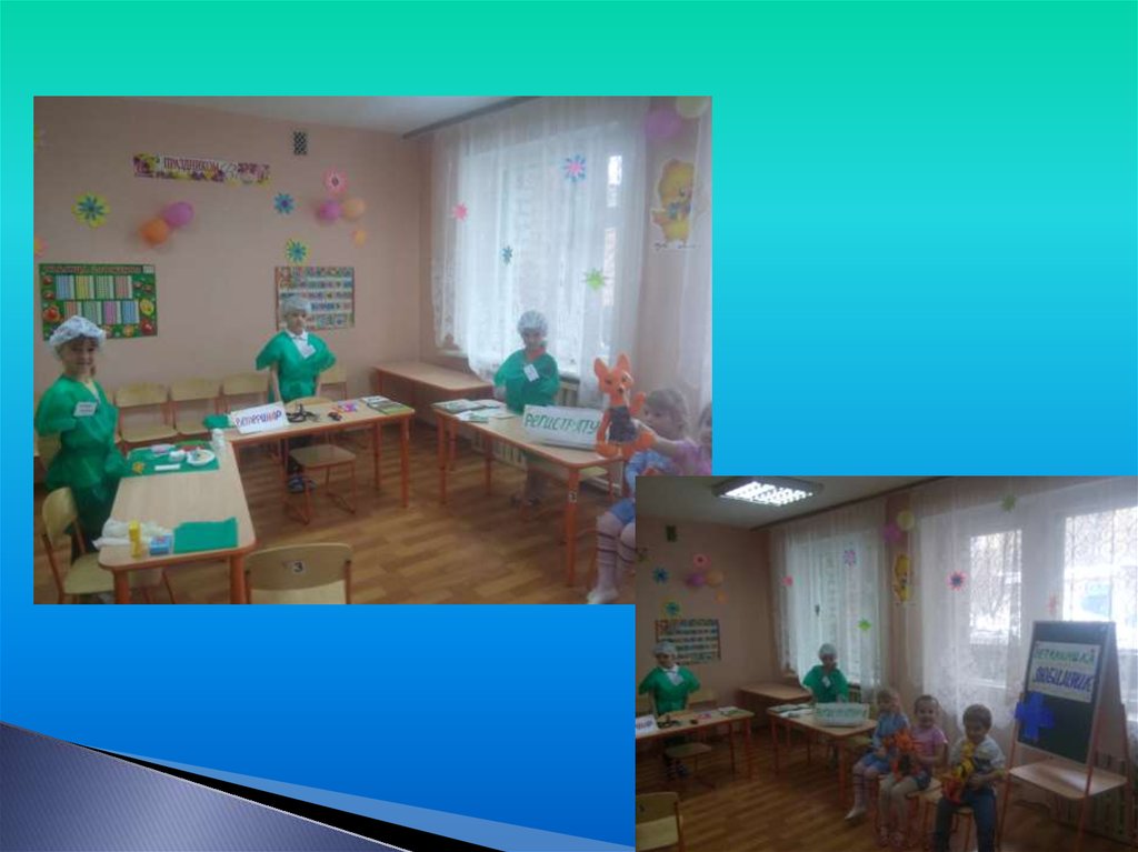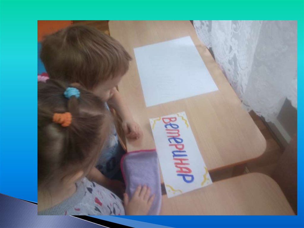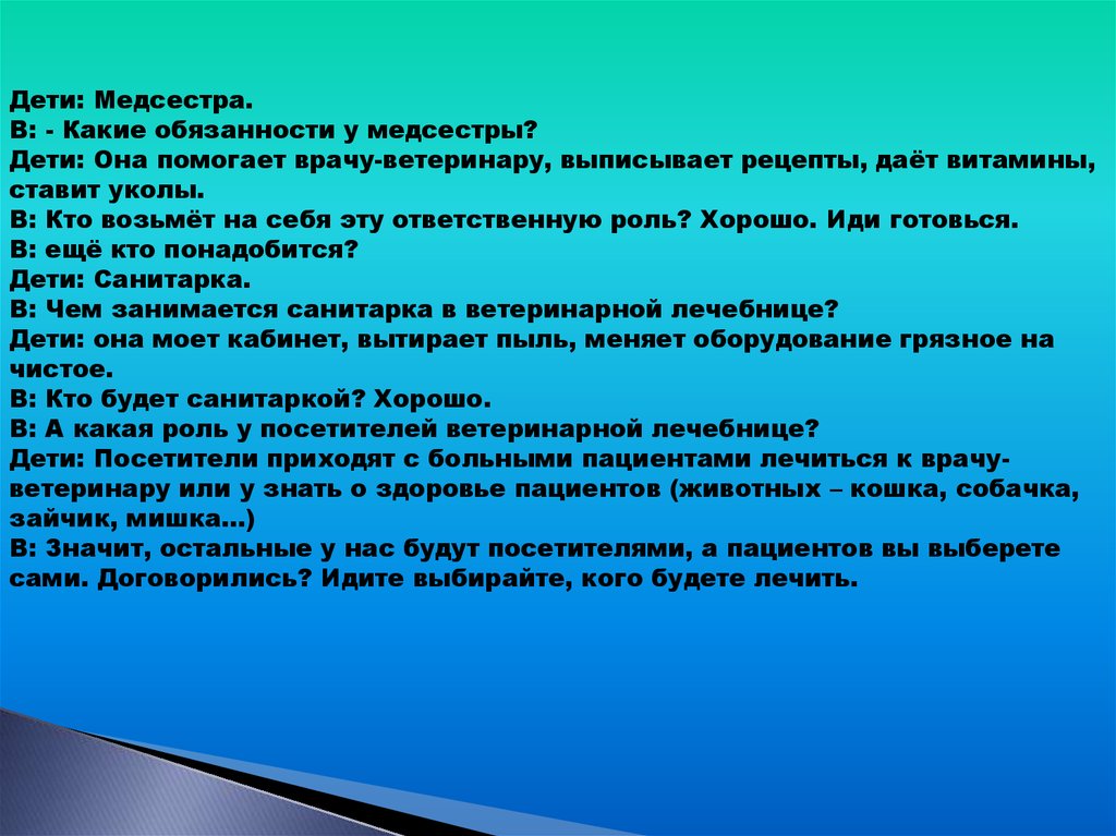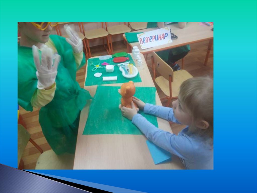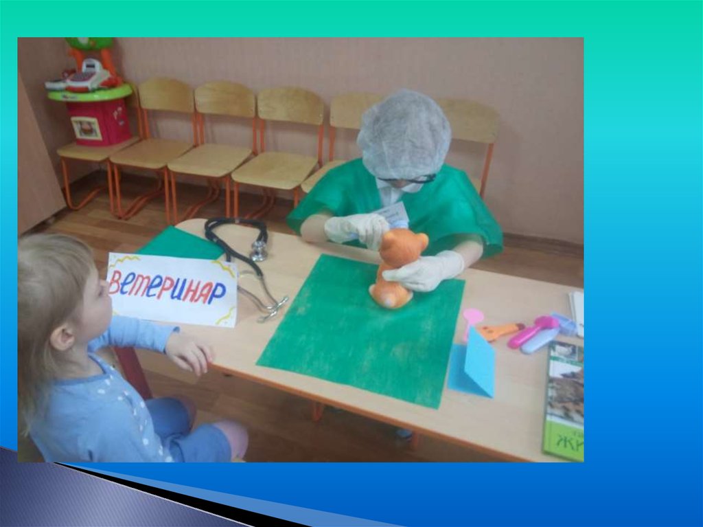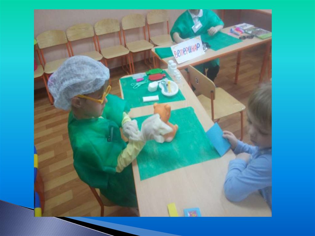 В: - Как вы думаете, роли каких профессий нам понадобятся в игре? (врачветеринар, медсестра, санитарка, посетители с пациентами).