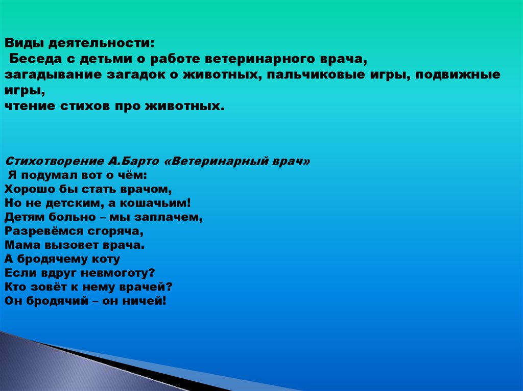 Виды деятельности:Беседа с детьми о работе ветеринарного врача,
