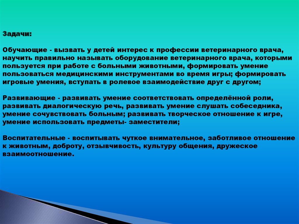 Задачи:Обучающие - вызвать у детей интерес к профессии ветеринарного врача,