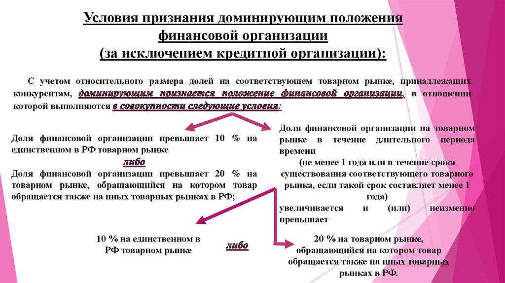 Условия признания доминирующим положенияфинансовой организации