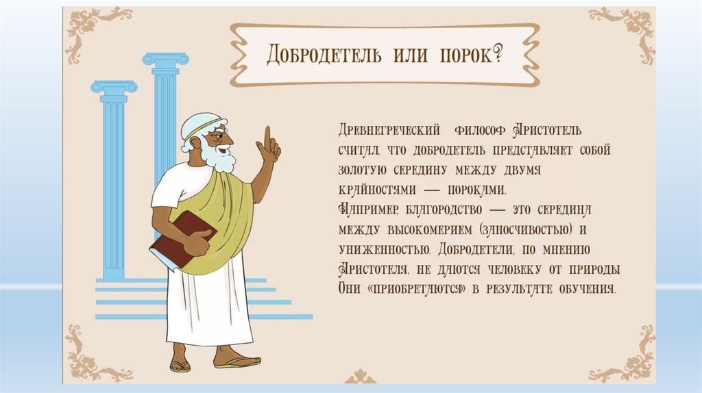 Добродетель — это середина между пороками чрезмерности и недостаточности тогокачества, которое олицетворяет добродетель.