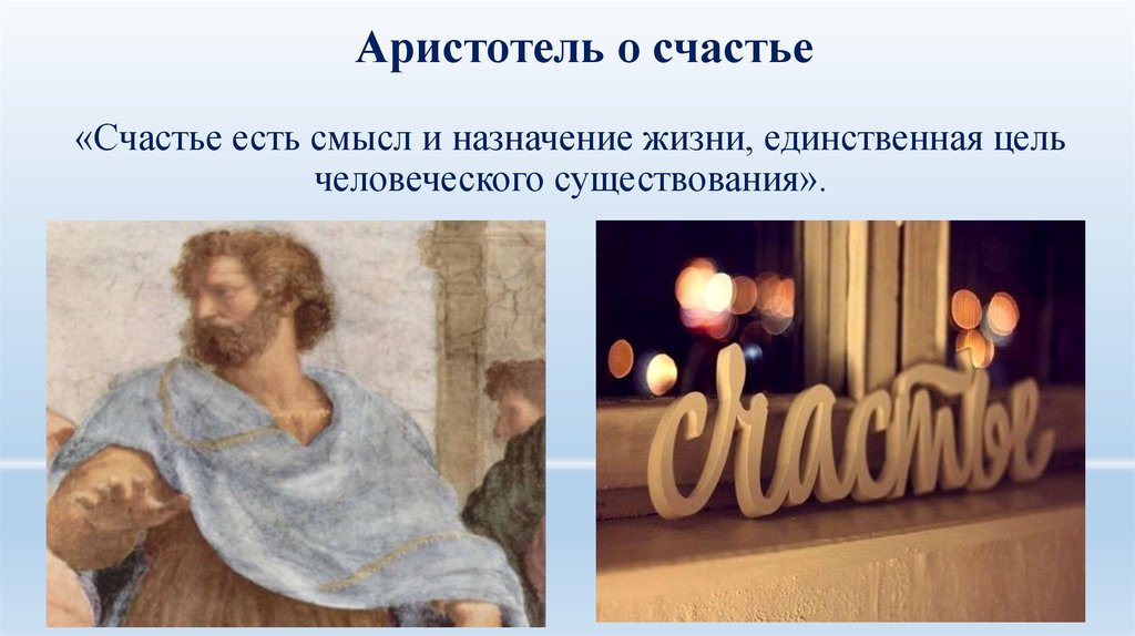 Аристотель о счастье«Счастье есть смысл и назначение жизни, единственная цель
