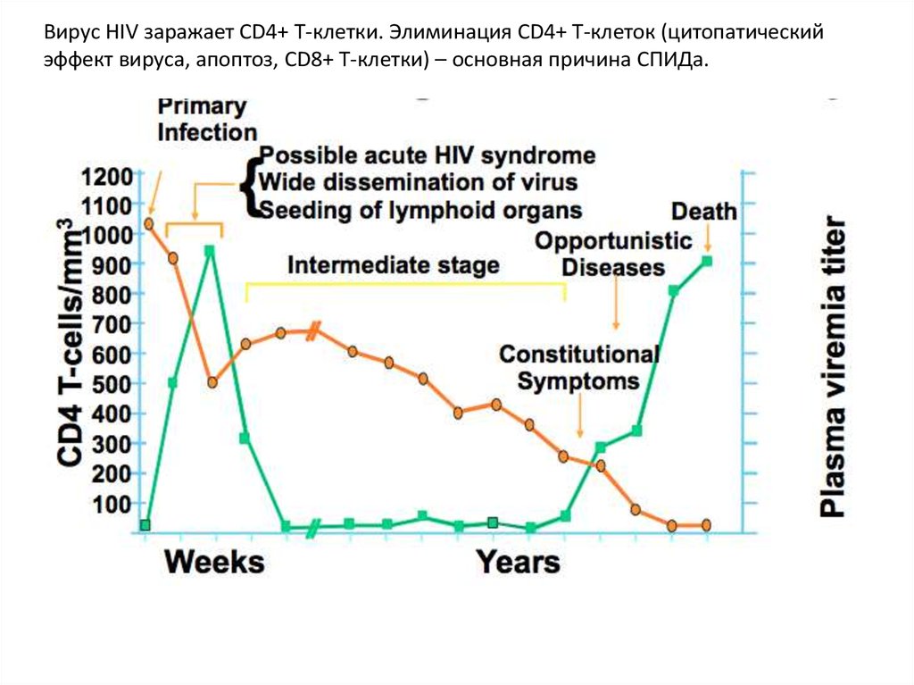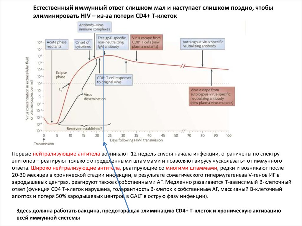 Естественный иммунный ответ слишком мал и наступает слишком поздно, чтобыэлиминировать HIV – из-за потери CD4+ T-клеток