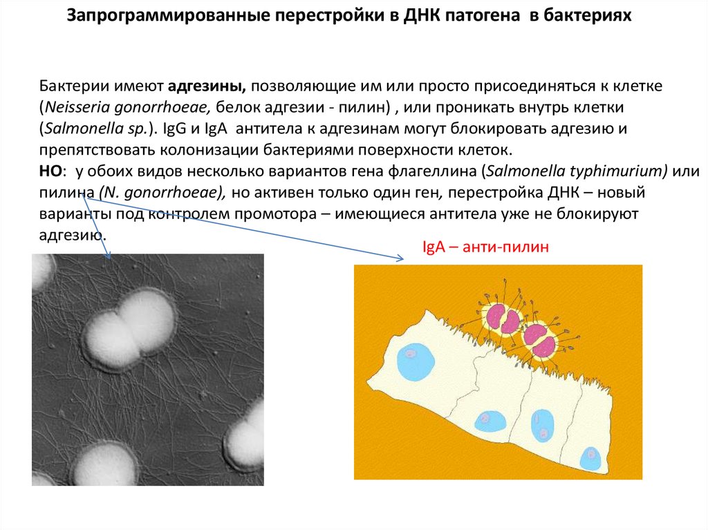 Запрограммированные перестройки в ДНК патогена в бактерияхБактерии имеют адгезины, позволяющие им или просто присоединяться к клетке