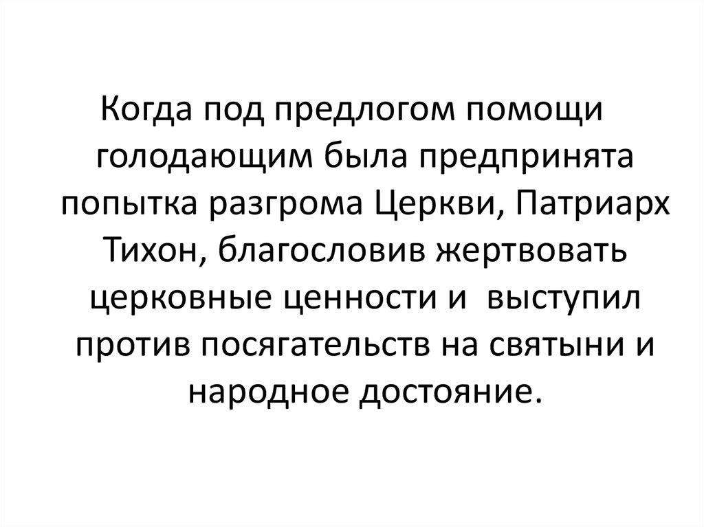 62. 21 августа 1921 года Патриархом Тихоном образован Всероссийский комитет помощи голодающим. который был закрыт по распоряжению властей через