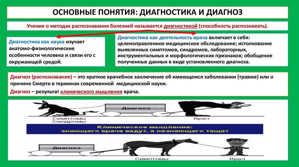 ОСНОВНЫЕ ПОНЯТИЯ: ДИАГНОСТИКА И ДИАГНОЗУчение о методах распознавания болезней называется диагностикой (способность распознавать).