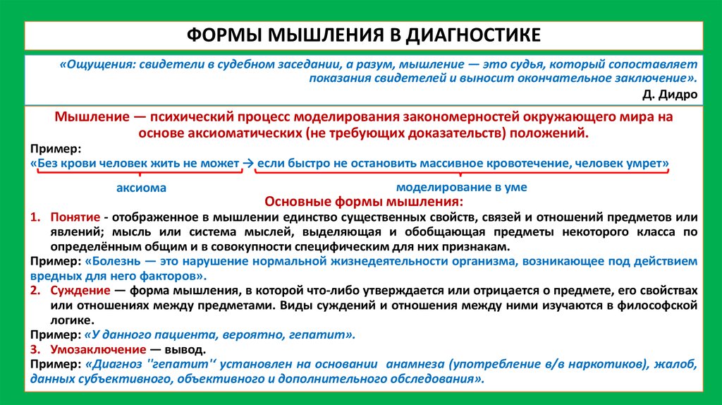 ФОРМЫ МЫШЛЕНИЯ В ДИАГНОСТИКЕ«Ощущения: свидетели в судебном заседании, а разум, мышление — это судья, который сопоставляет