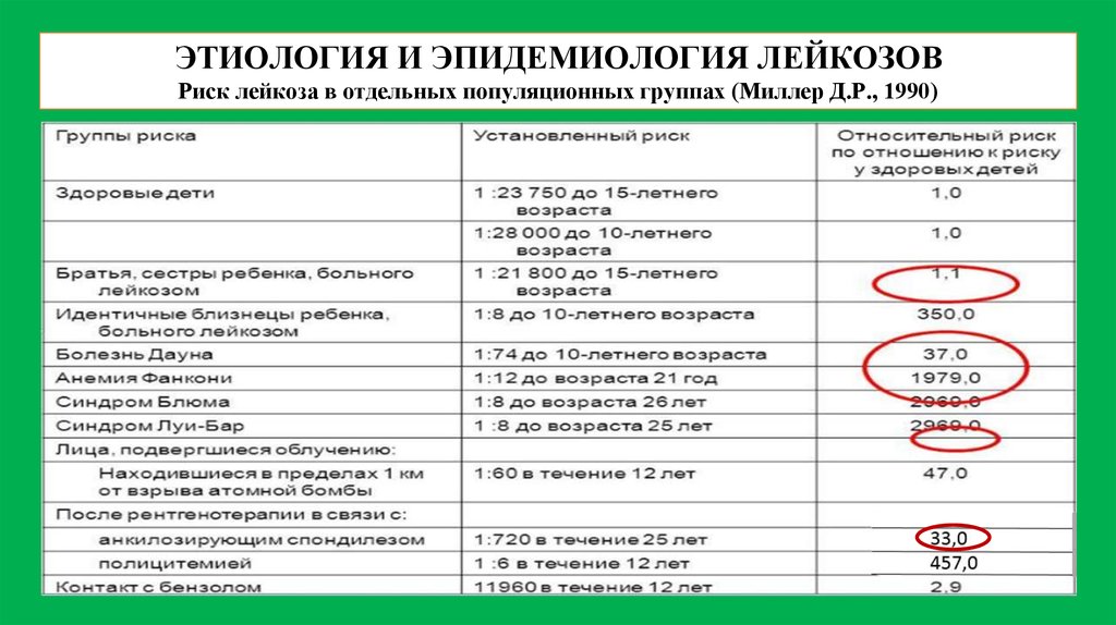 ЭТИОЛОГИЯ И ЭПИДЕМИОЛОГИЯ ЛЕЙКОЗОВРиск лейкоза в отдельных популяционных группах (Миллер Д.Р., 1990)