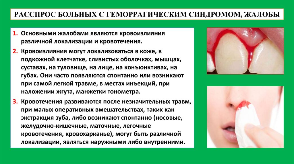 - Наблюдаются спонтанные кровотечения из слизистой оболочки ротовой и