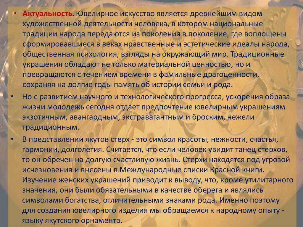 • Актуальность. Ювелирное искусство является древнейшим видомхудожественной деятельности человека, в котором национальные
