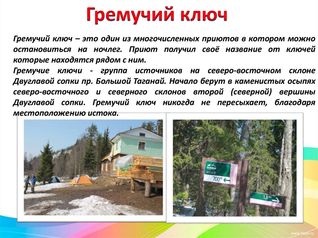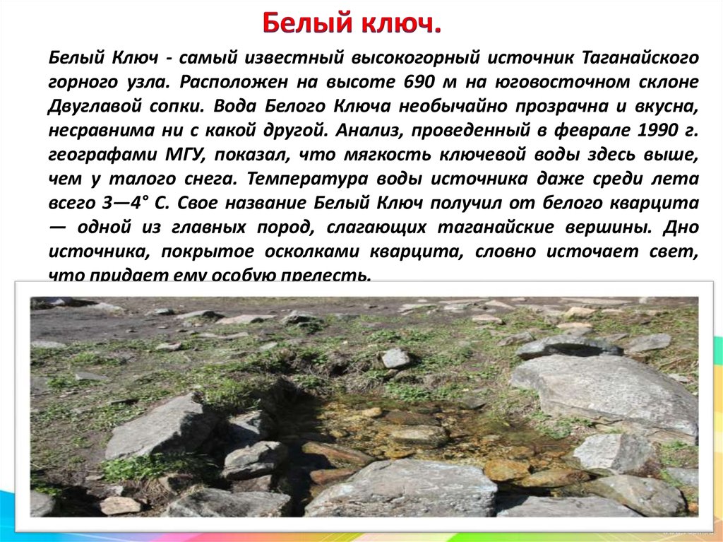 Белый Ключ - самый известный высокогорный источник Таганайскогогорного узла. Расположен на высоте 690 м на юговосточном склоне
