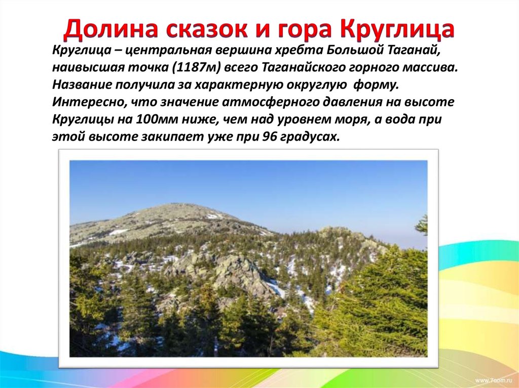 Круглица – центральная вершина хребта Большой Таганай,наивысшая точка (1187м) всего Таганайского горного массива.