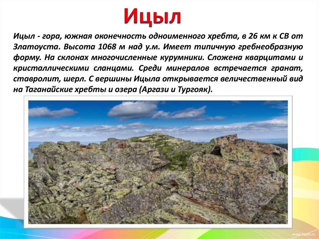 Ицыл - гора, южная оконечность одноименного хребта, в 26 км к СВ отЗлатоуста. Высота 1068 м над у.м. Имеет типичную гребнеобразную
