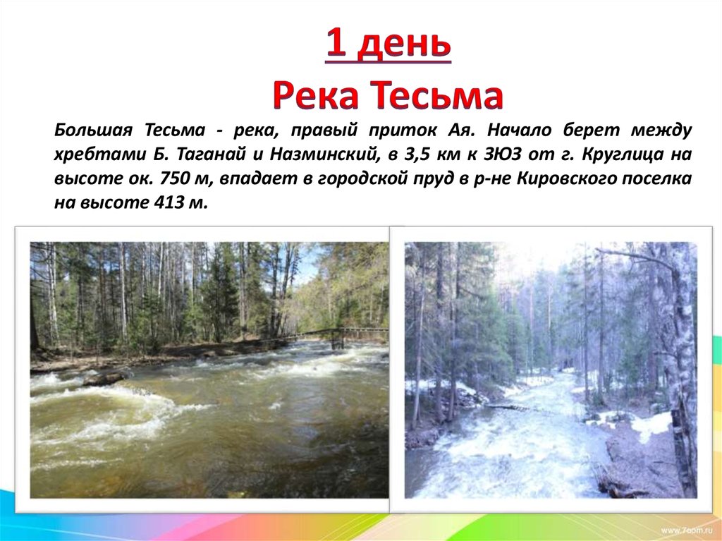 Большая Тесьма - река, правый приток Ая. Начало берет междухребтами Б. Таганай и Назминский, в 3,5 км к ЗЮЗ от г. Круглица на