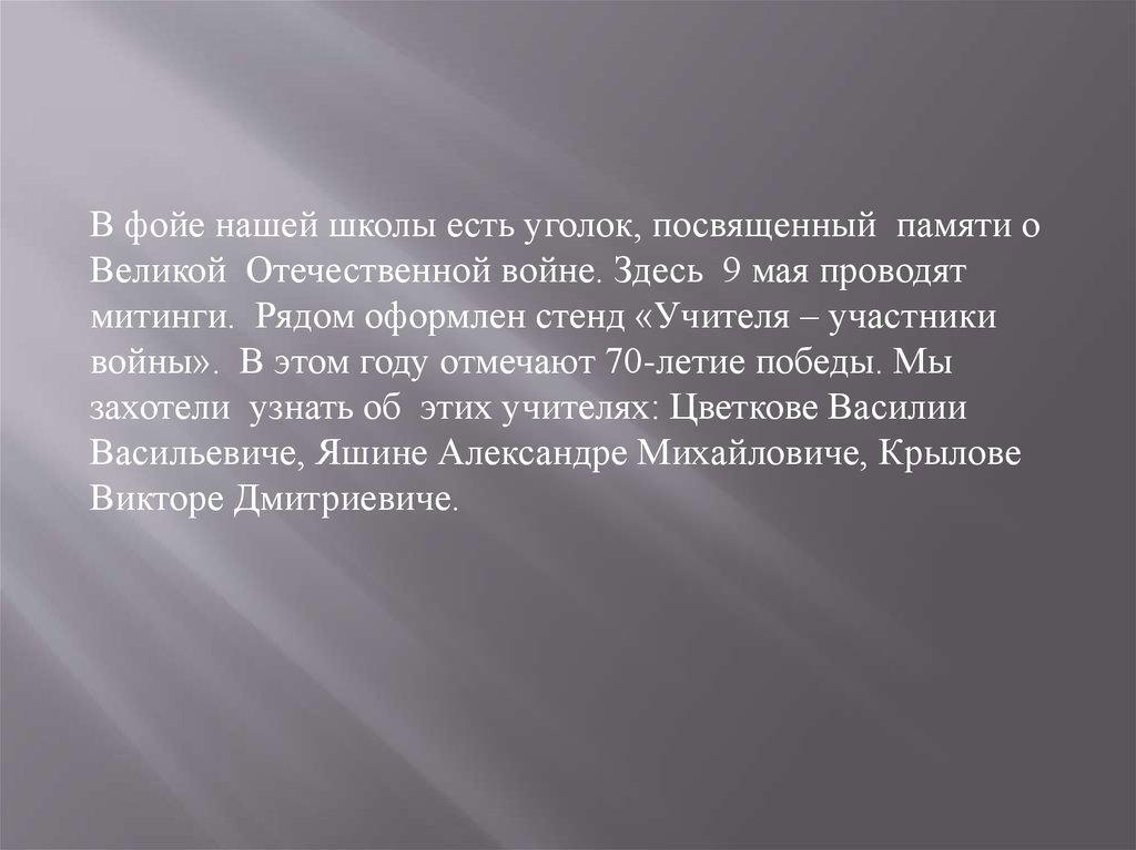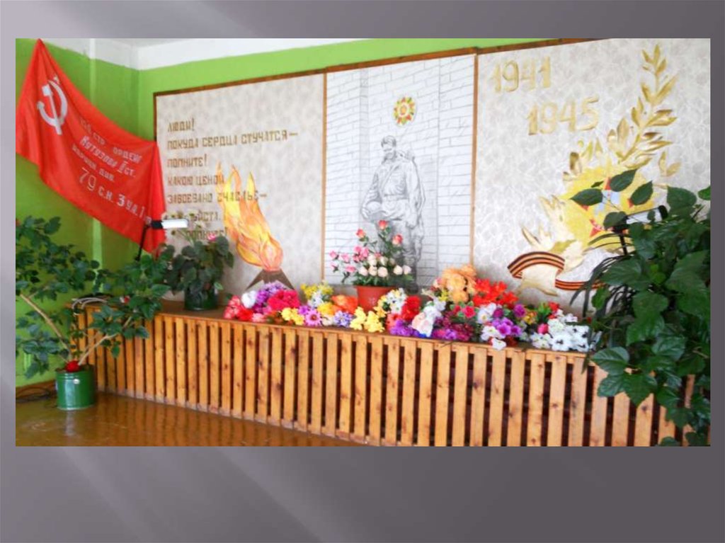 В фойе нашей школы есть уголок, посвященный памяти оВеликой Отечественной войне. Здесь 9 мая проводят
