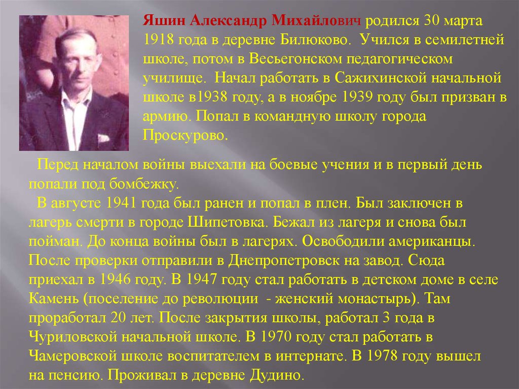 Яшин Александр Михайлович родился 30 марта1918 года в деревне Билюково. Учился в семилетней