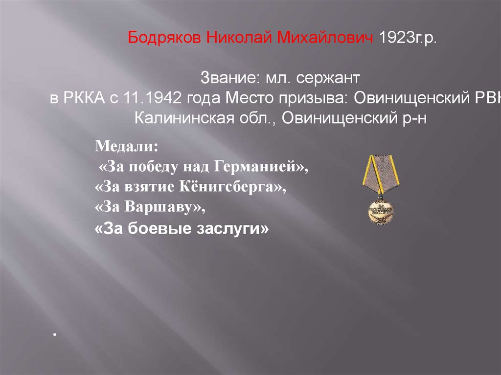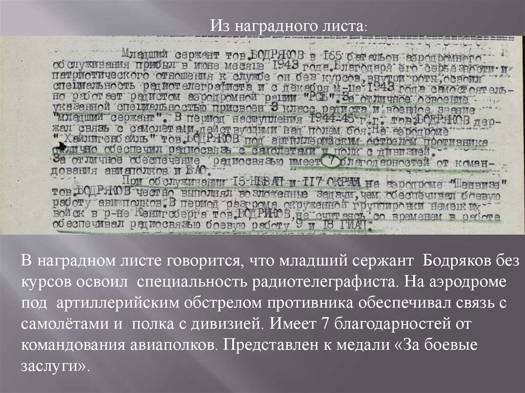 Из наградного листа:В наградном листе говорится, что младший сержант Бодряков без