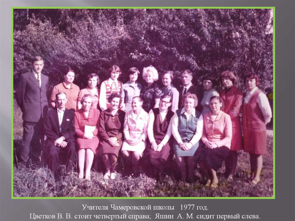 Учителя Чамеровской школы 1977 год.Цветков В. В. стоит четвертый справа; Яшин А. М. сидит первый слева.