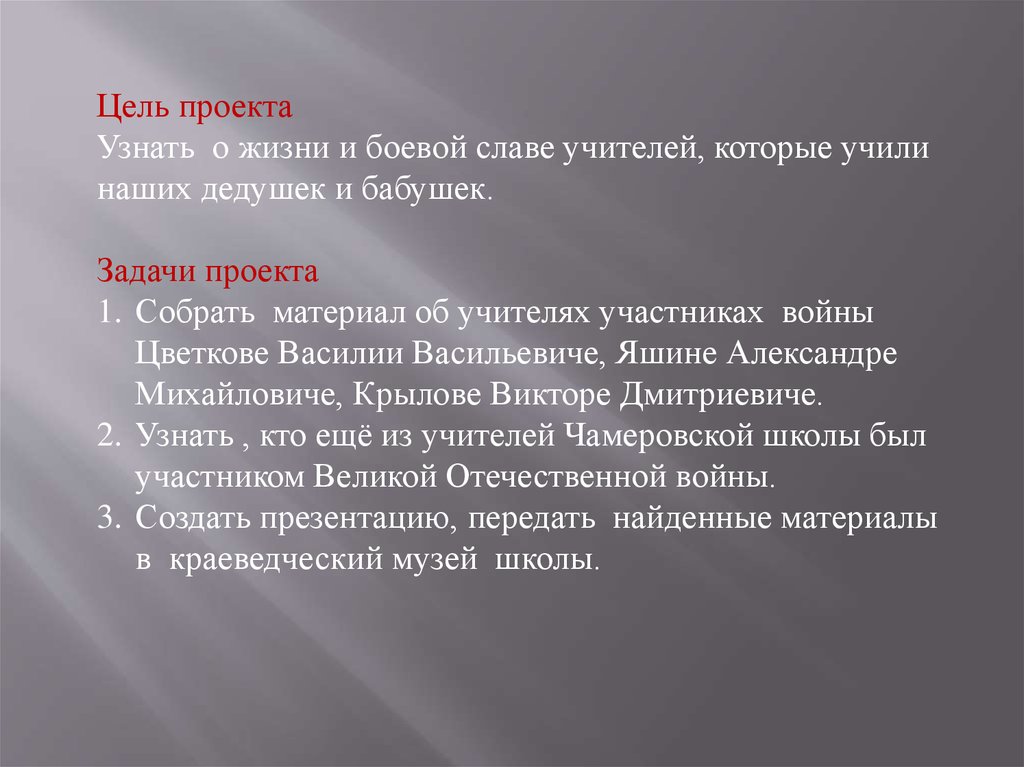 Цель проектаУзнать о жизни и боевой славе учителей, которые учили