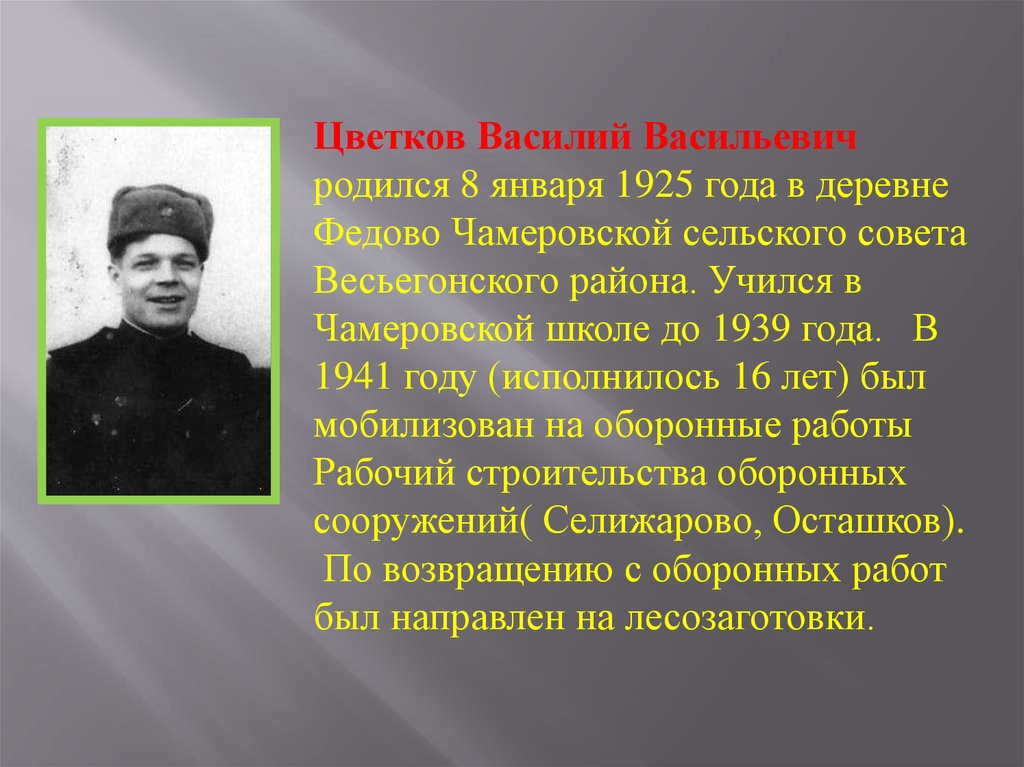 Цветков Василий Васильевичродился 8 января 1925 года в деревне