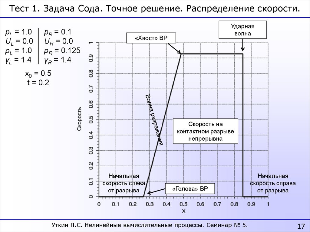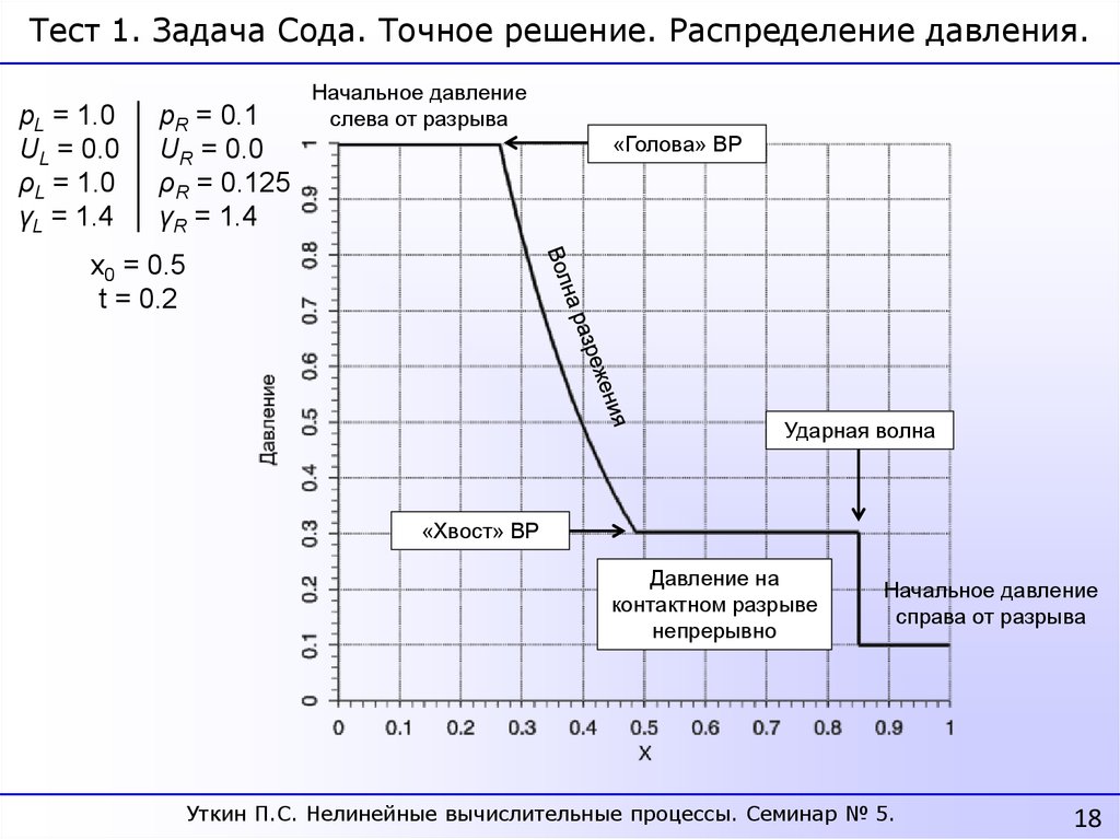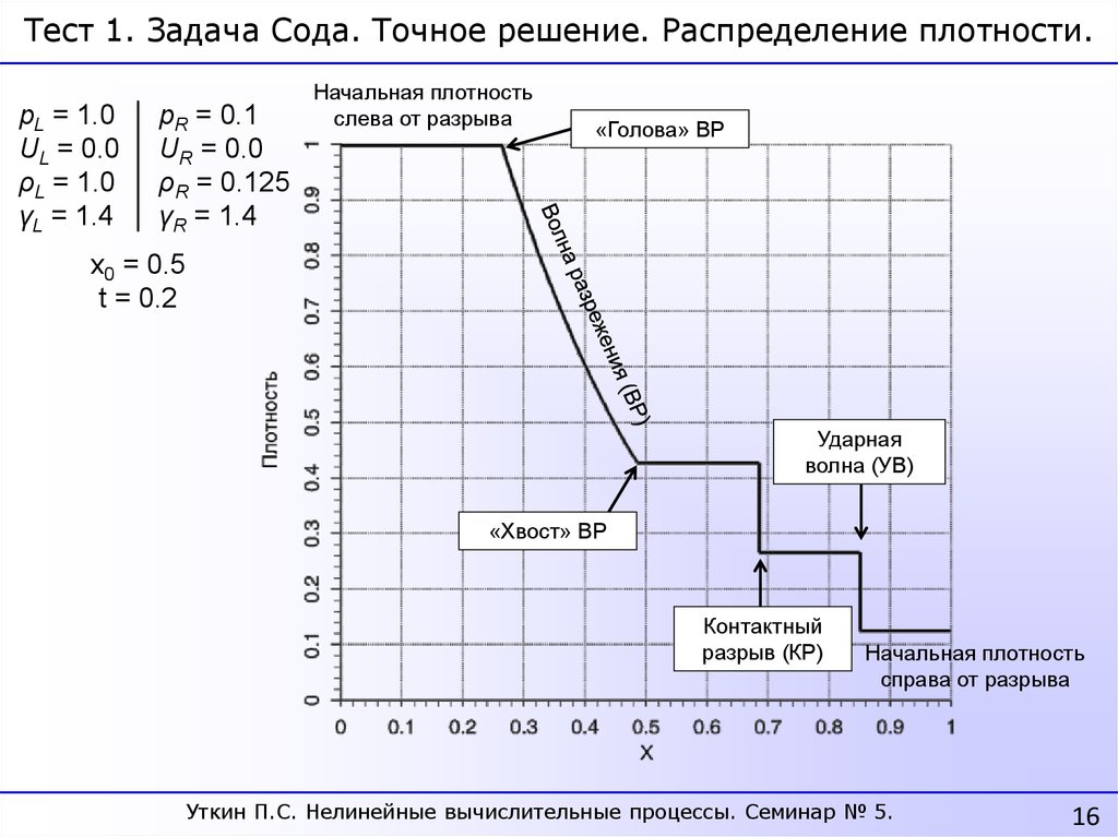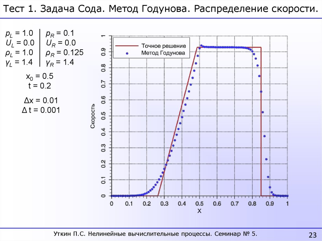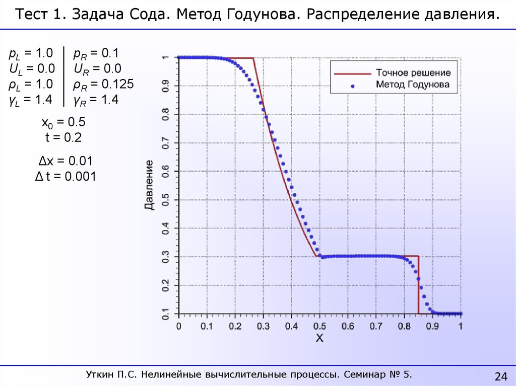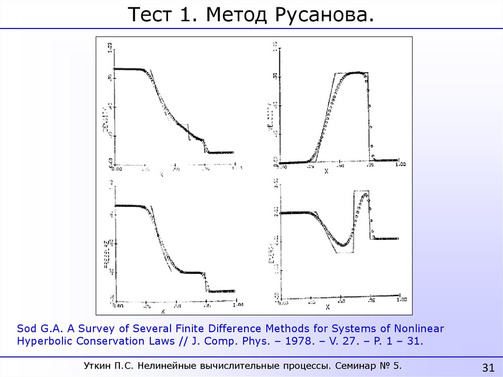 Тест 1. Метод Русанова.Sod G.A. A Survey of Several Finite Difference Methods for Systems of Nonlinear